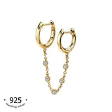 The ultimate for multiple piercings, edgy double hoop earring features two small hoops that connect with a dangling sparkling CZ gem stone chain. Wear this better than basic chain earring to add some glam to your everyday look or with a black dress to rock your next night out. Nothing like this beautiful pair to get the signature look by mixing and layering our cartilage earrings for your very own ear stack.