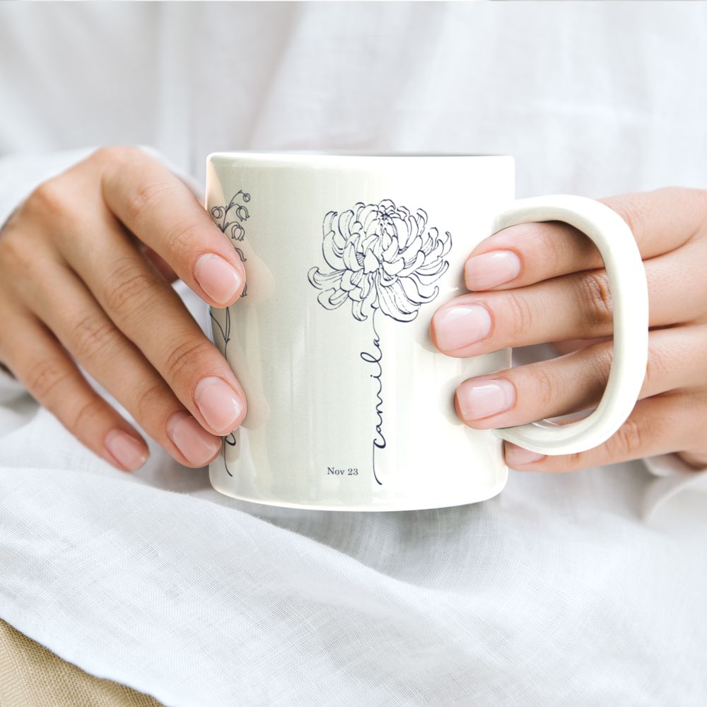 Our custom-made Birth Flower coffee mug is the perfect gift idea for a family member's birthday or other special occasion. With its unique design featuring your loved one's birthday flower and a stem designed using their name, this coffee cup is sure to impress. Crafted at high temperatures of 820 degrees for four hours, it's not only stunning but also durable enough to withstand the intense heat of brewing.