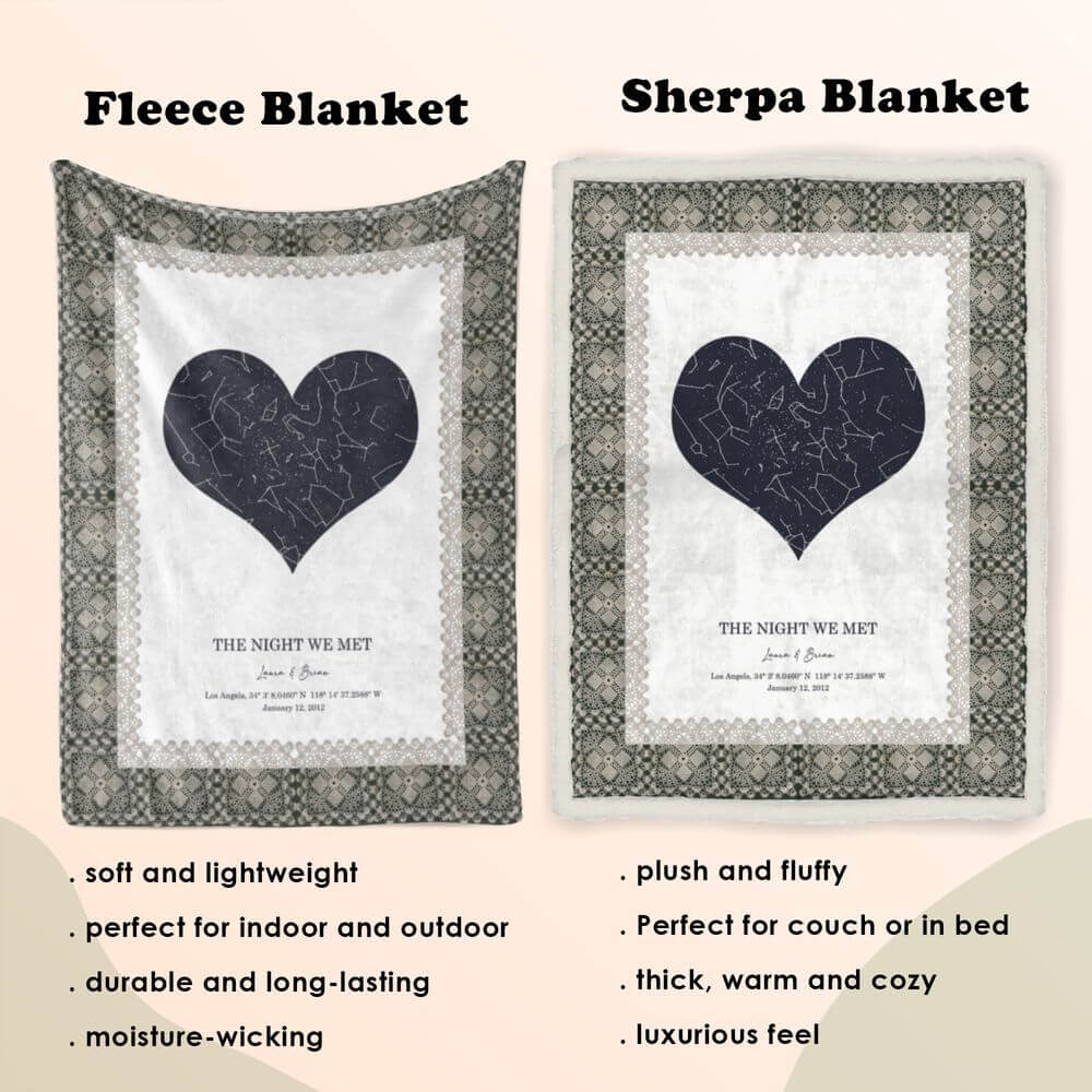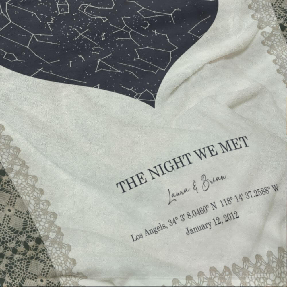 Looking for a unique and personalized gift for your special occasion? A custom Star Map blanket is the perfect choice. This beautiful and functional blanket features a stunning night sky print with the exact star map of your chosen date and location. The constellations on the blanket are expertly personalized to reflect the exact time and place of your special moment and the elegant crochet with different color backgrounds add an extra touch of personality to the design. Made from high-quality materials, this blanket is both soft and durable, making it a cherished keepsake for years to come. Ideal for weddings, anniversaries, or any milestone event, this personalized gift is sure to make a lasting impression.