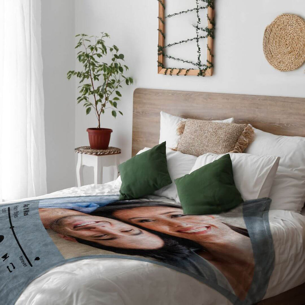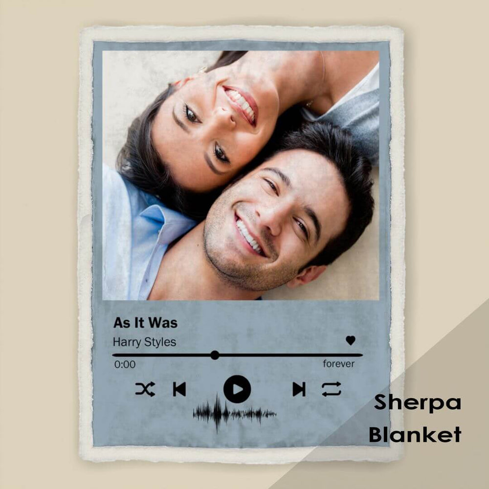Bring back fond memories and show your love with this nostalgic personalized music blanket! Featuring a beautiful photo of the two of you together and boyfriend, husband favorite song lyrics printed in a classic font, this blanket is sure to bring a smile to his face every time he sees it. Made with soft and cozy materials, it's the perfect way to keep him comfortable and reminded of your love for him. Give the gift of memories and love with this sentimental gift for Valentine's Day. #SweetestSurprise