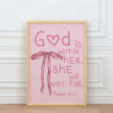 Our Pink Christian Printable Wall Art featuring a stylish, preppy pink design and the empowering Bible verse from Psalms 46:5: “God is within her, she will not fall.” This digital art piece combines bold typography with a playful pink knot design, making it the perfect addition to a Christian girl’s dorm room, a child’s bedroom, or any area where faith and inspiration are welcomed.