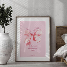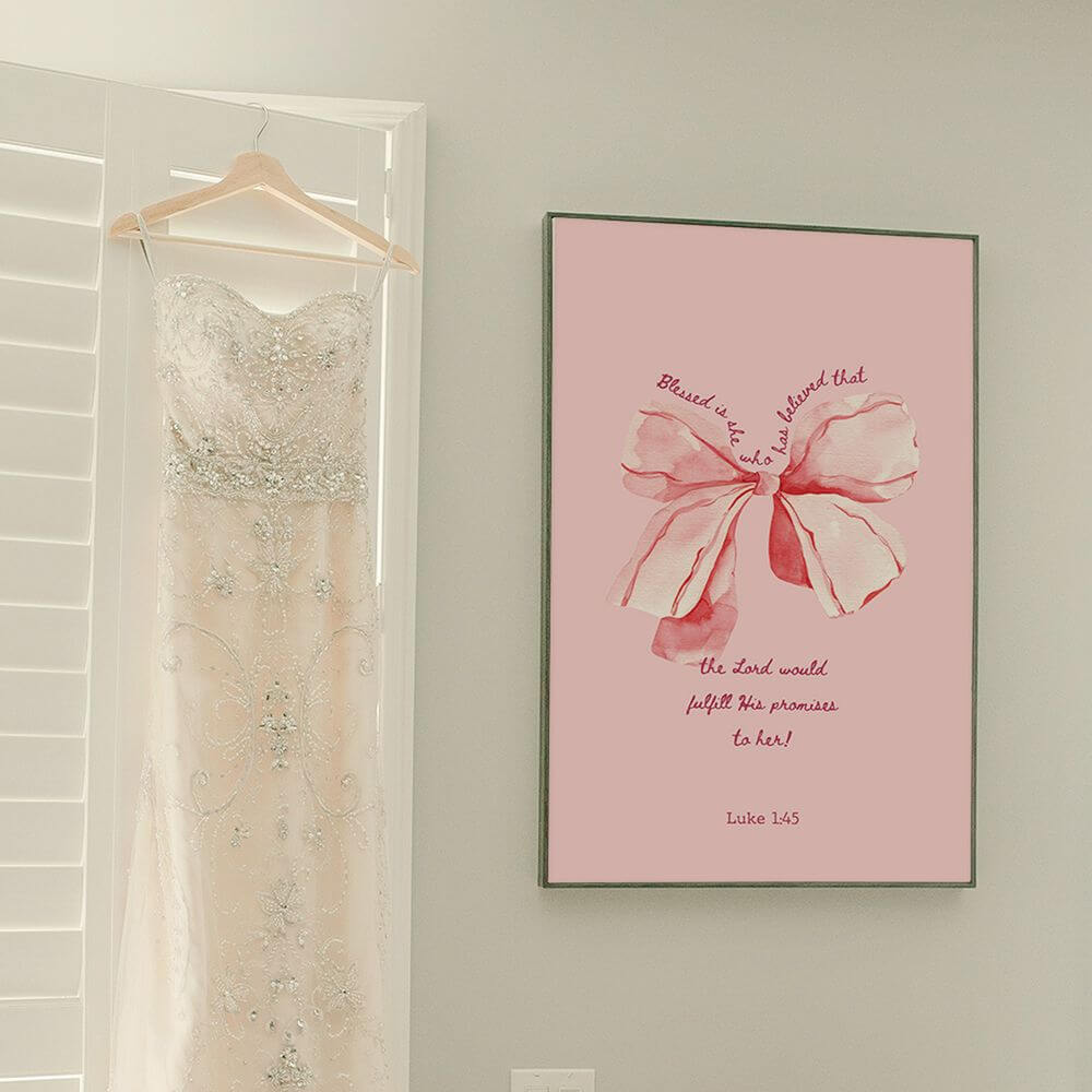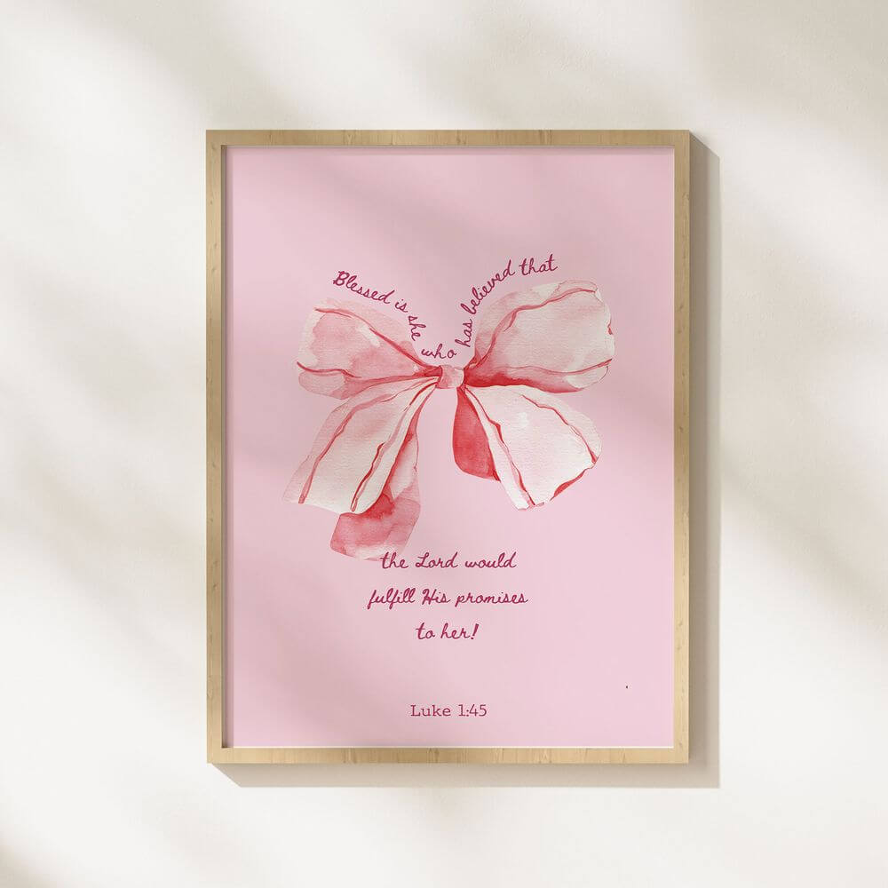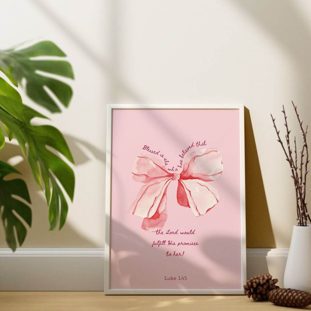 Our Pink Christian Printable Wall Art featuring a stylish, preppy pink design and the empowering Bible verse from Luke 1:45: “Blessed is she who has believed that the Lord would fulfill His promises to her!” This printable Bible verse wall art blends modern typography with a playful pink knot design, perfectly complementing a pink room decor aesthetic. It's an ideal addition to a Christian room, girl’s nursery, girl boss office, or any space where faith and inspiration are embraced.