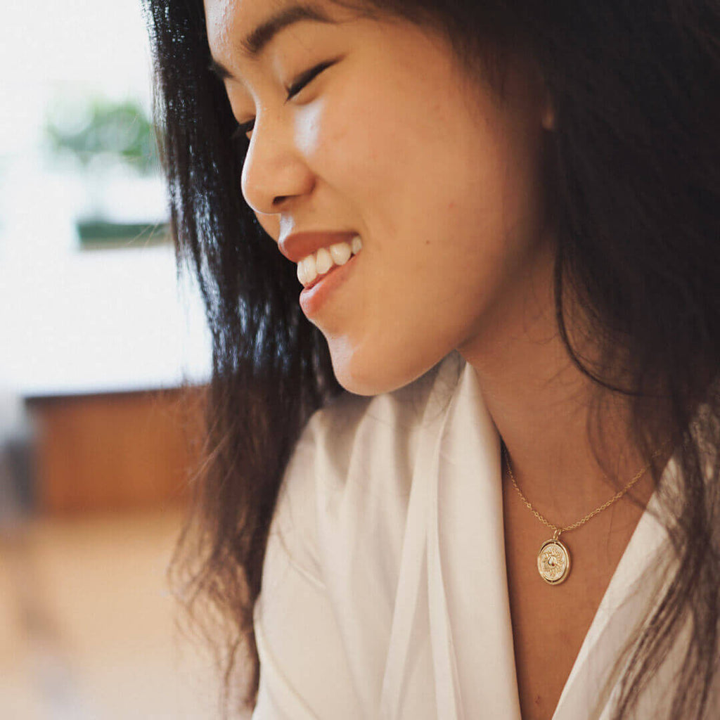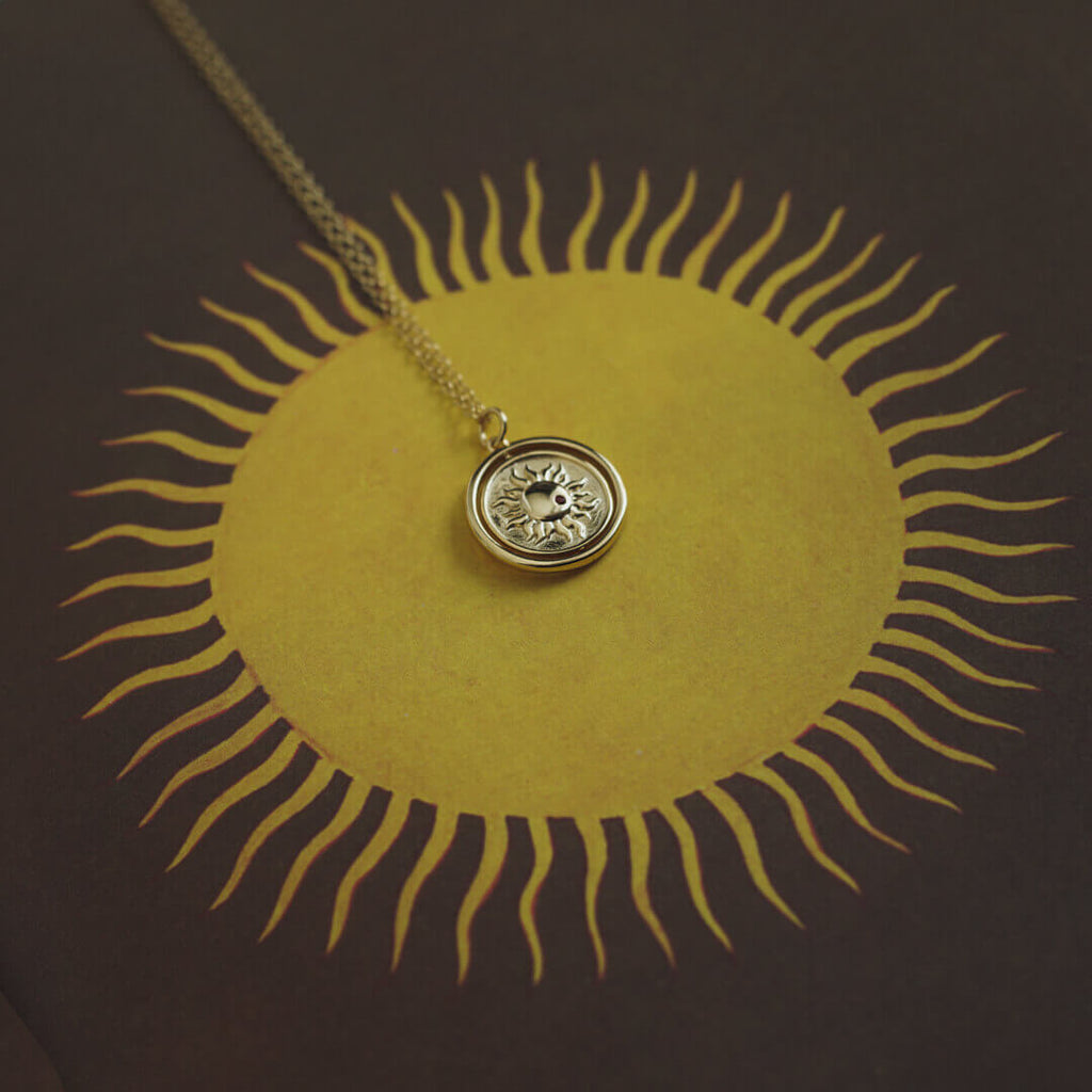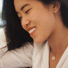 Britt sterling silver necklace is in our celestial fashion, one of the most beloved themes. The gorgeous 18k gold vermeil coin necklace is set with a reversible double sides medallion pendant. The sun pattern featured with a red high-grade CZ gem represents as "Day" side. The Moon and blue CZ gem-studded star make the "Night" side sparkling. Wearing a Britt gold necklace to get empowered, promote your courage, and shining in your unique way everyday.